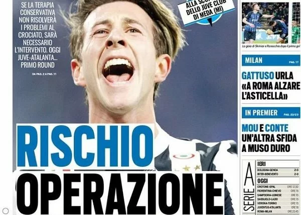 Tuttosport apre con l’infortunio di Bernardeschi: “Rischio operazione“. Di spalla l’anticipo serale di Serie A: “Benevento KO. L’Inter si salva con Skriniar e Ranocchia“.