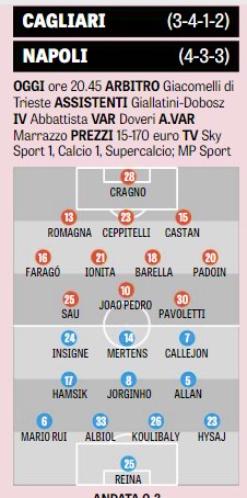 Siamo nel match day di Cagliari-Napoli, con gli azzurri che hanno quasi l’obbligo di allungare a +4 sulla Juve. La Gazzetta dello Sport propone le probabili formazioni della gara di questa sera: