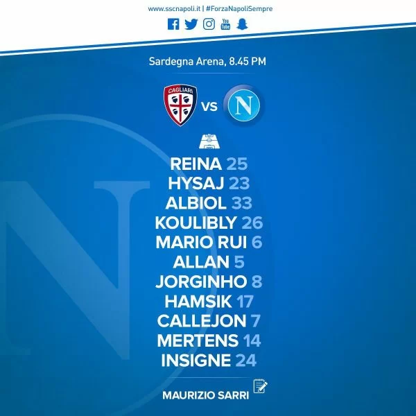 Sono ufficiali le formazioni di Cagliari-Napoli. Mister Sarri non cambia il suo undici, sull’out mancino c’è ancora Mario Rui che ha recuperato da un piccolo acciacco fisico subito durante la gara con il Lipsia.