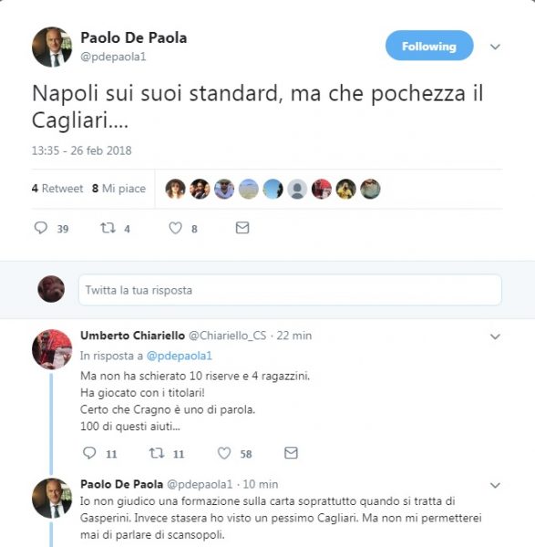 “Napoli sui suoi standard, ma che pochezza il Cagliari…“, questo quanto scritto dal giornalista al quale risponde il collega di Canale 21, Umberto Chiariello: “Ma non ha schierato 10 riserve e 4 ragazzini. Ha giocato con i titolari! Certo che Cragno è uno di parola. 100 di questi aiuti…“.