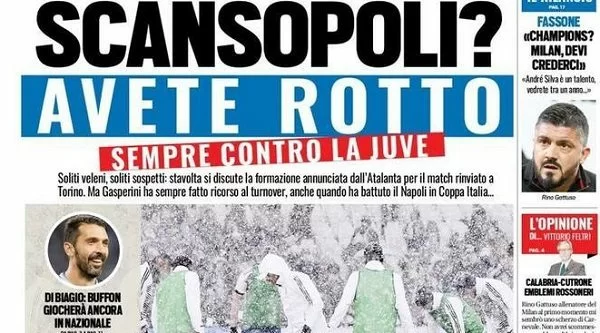 Il portiere della Juventus ha infatti attaccato coloro che parlano di squadre che si scansano d’innanzi alla Juve: “Scansopoli? Avete rotto! Sempre contro la Juve. Soliti veleni, soliti sospetti: stavolta si discute la formazione annunciata dall’Atalanta per il match rinviato a Torino. Ma Gasperini ha sempre fatto ricorso al turnover, anche quando ha battuto il Napoli in Coppa Italia“.