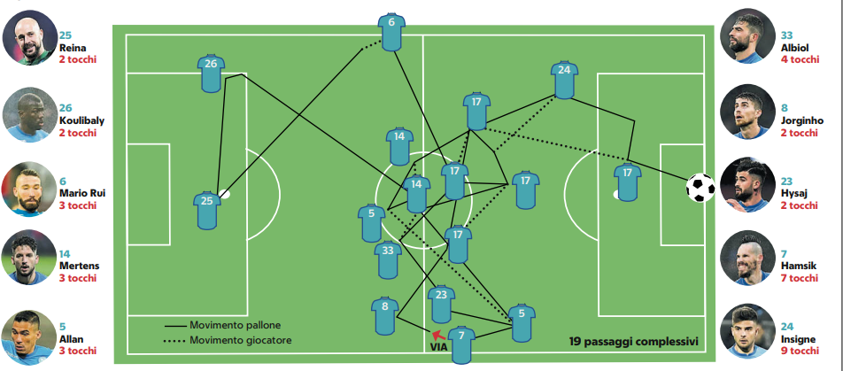 Nelle scorse settimane è stato lo stesso allenatore a paragonare il suo Napoli alla grande Olanda degli anni ’70, dividendo il pensiero di tifosi ed addetti ai lavori. Questa mattina l’odierna edizione di Repubblica con un interessante grafico sottolinea una particolare conformità del terzo gol del Napoli, quello di Marek Hamsik, a quello dell’Olanda della finale Mondiale del 1974 contro la Germania. Una spettacolare sinfonia di 19 tocchi divisi tra tutti i calciatori, con Insigne leader, non solo per tocchi, ma anche per l’assist finale per il capitano slovacco.