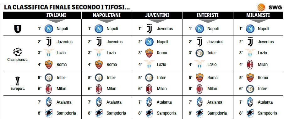 Il sondaggio tra i tifosi italiani, condotto da Swg per Gazzetta, presenta dati interessanti. Tra i tifosi, infatti, solo gli juventini credono ancora in una vittoria della propria squadra del cuore, nella percentuale del 66%, mentre il 30% dei bianconeri è convinto che la propria striscia di vittorie è destinata a fermarsi, dando come favorito il Napoli. Il restante 4% oscilla tra indecisione e scaramanzia. Addirittura il 75% della tifoseria dell’Inter si schiera col Napoli per la vittoria dello scudetto.