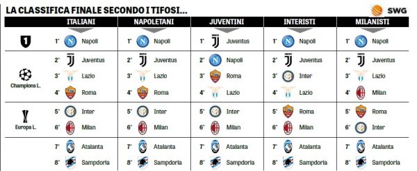 Il sondaggio tra i tifosi italiani, condotto da Swg per Gazzetta, presenta dati interessanti. Tra i tifosi, infatti, solo gli juventini credono ancora in una vittoria della propria squadra del cuore, nella percentuale del 66%, mentre il 30% dei bianconeri è convinto che la propria striscia di vittorie è destinata a fermarsi, dando come favorito il Napoli. Il restante 4% oscilla tra indecisione e scaramanzia. Addirittura il 75% della tifoseria dell’Inter si schiera col Napoli per la vittoria dello scudetto.