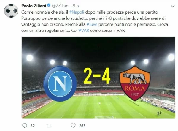 Queste le sue parole: “Com’è normale che sia, il Napoli dopo mille prodezze perde una partita. Purtroppo perde anche lo scudetto, perché i 7-8 punti che dovrebbe avere di vantaggio non ci sono. Perché alla Juve perdere punti non è permesso. Gioca con un altro regolamento. Col VAR come senza il VAR”