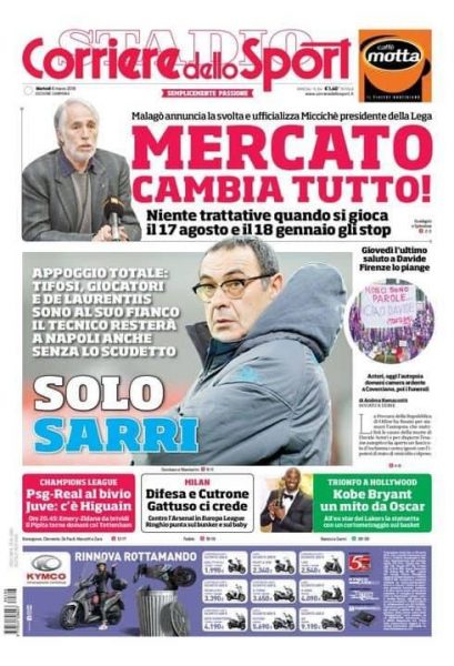 Online la prima pagina del Corriere dello Sport, che dedica ampio spazio alla rivoluzione del calendario di Serie A annunciata dal commissario straordinario Malagò, ma soprattutto punta l’accento sulla permanenza di Maurizio Sarri sulla panchina del Napoli, indipendentemente dall’esito del campionato: