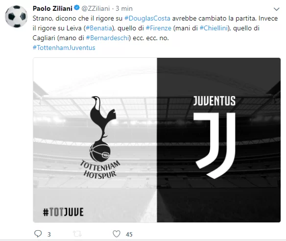 Bianconeri in protesta per il rigore negato su Douglas Costa, allora Ziliani ha punzecchiato i bianconeri ricordando quelli che, a detta loro, sono i rigori che non avrebbero “cambiato” le partite.