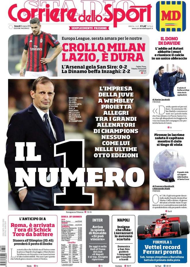 Online la prima pagina del Corriere dello Sport, che incorona Massimiliano Allegri, allenatore della Juventus come numero 1 e dà spazio alle sfide di Europa League, con la sconfitta del Milan e il pareggio della Lazio.