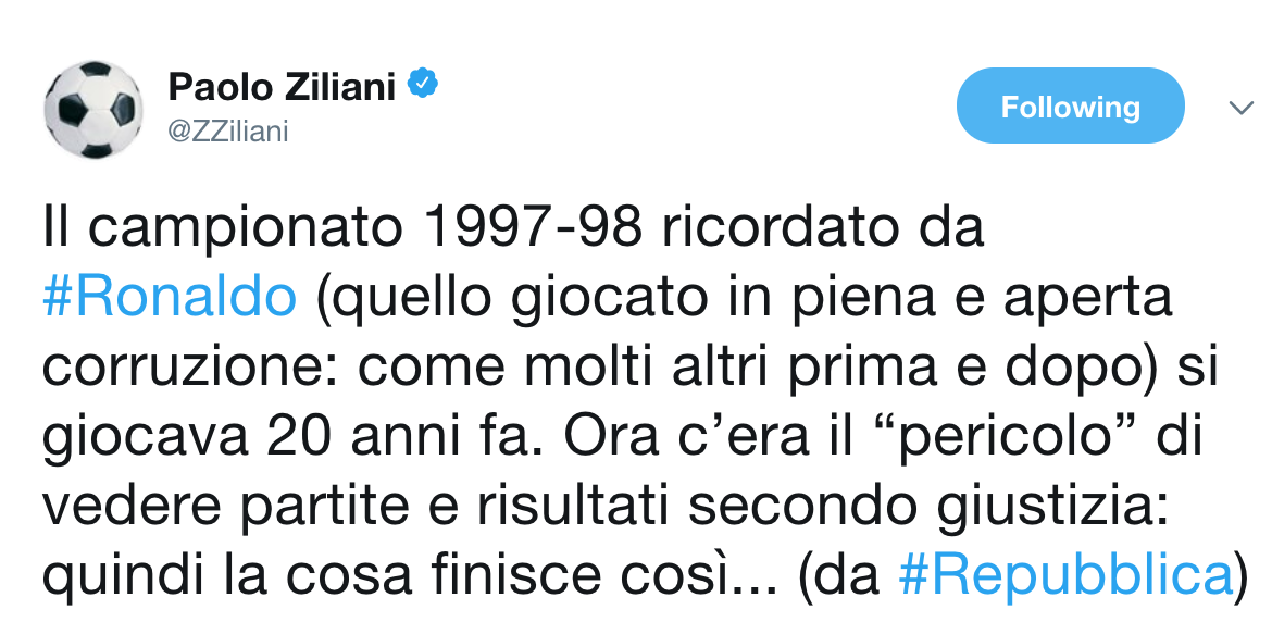 Il giornalista de Il Fatto Quotidiano Paolo Ziliani ha, ripartendo dalle parole di Ronaldo, voluto porre l’accento sulla recente e reiterata mancata utilizzazione del VAR commentando su Twitter un articolo di Repubblica dal titolo “Hanno spento il VAR, la fine delle certezze sul calcio trasparente” così: “Il campionato 1997-98 ricordato da Ronaldo (quello giocato in piena e aperta corruzione: come molti altri prima e dopo) si giocava 20 anni fa. Ora c’era il “pericolo” di vedere partite e risultati secondo giustizia: quindi la cosa finisce così…”