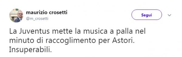 E così è stato, almeno quasi dovunque. Sì, perché il giornalista Maurizio Crosetti, presente all’Allianz Stadium per seguire Juventus-Udinese, ha rivelato che durante il minuto di silenzio nell’impianto di Torino è stata fatta ascoltare musica ad alto volume. Questo quanto scritto su Twitter: “La Juventus mette la musica a palla nel minuto di raccoglimento per Astori. Insuperabili“.