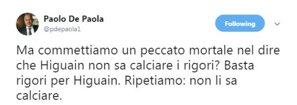 Il penalty fallito ha fatto infuriare il direttore di Tuttosport, Paolo De Paola, che su Twitter ha inveito contro Higuain: “Ma commettiamo un peccato mortale nel dire che Higuain non sa calciare i rigori? Basta rigori per Higuain. Ripetiamo: non li sa calciare“.