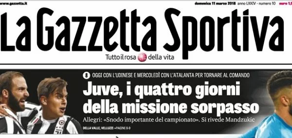 Ebbene, proprio in virtù del calendario favorevole, l’edizione odierna de La Gazzetta dello Sport apre in prima pagina con: “Juve, i quattro giorni della missione sorpasso“. Il titolo non deve essere piaciuto troppo al giornalista Paolo Ziliani che su Twitter ha risposto: “… quattro giorni? A noi la missione sembra più lunga, con arbitri e #VAR trafficano da almeno quattro mesi“.