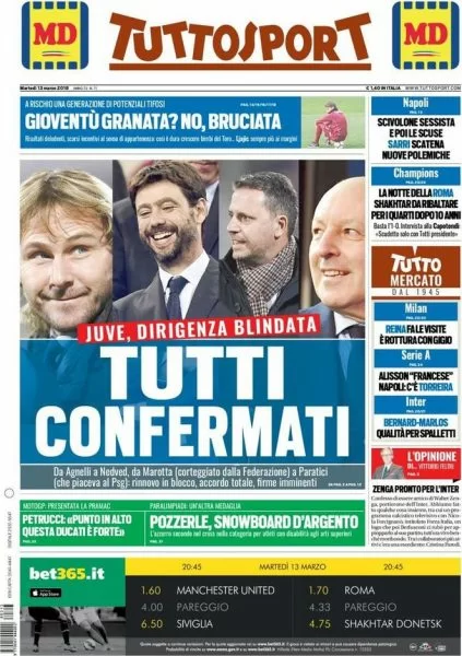 Online la prima pagina di Tuttosport, che dedica ampio spazio alla dirigenza della Juventus, ma si sofferma anche sul Napoli, sottolineando la trattativa ben avviata per Torreira e dedica ampio spazio anche alle polemiche relative alla risposta di Sarri alla collega Titti Improta: “Scivolone sessista e poi le scuse. Sarri scatena nuove polemiche”.