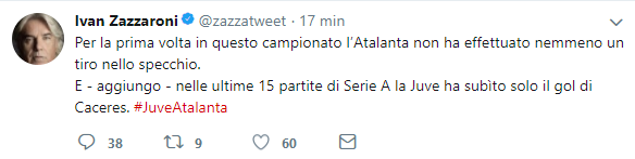Nessuna accusa, ci mancherebbe altro: piuttosto è curioso il modo che alcune squadre, Atalanta compresa, hanno di affrontare la Juve. Ed è quantomai singolare che una squadra abituata a tirare, chiuda una partita senza un solo calcio nello specchio…