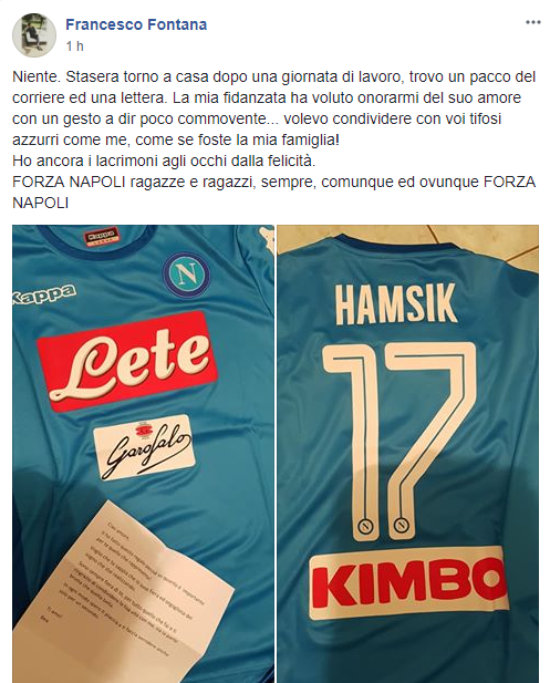 La fidanzata di Francesco ha voluto regalargli, con un gesto da lui stesso definito “commovente”, la maglia di Marek Hamsik. Il risultato? Lacrimoni agli occhi.