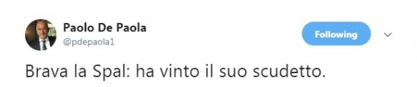 Al termine del match il direttore di Tuttosport, Paolo De Paola, ha commentato con un tweet di particolare interpretazione: “Brava la Spal: ha vinto il suo scudetto“.