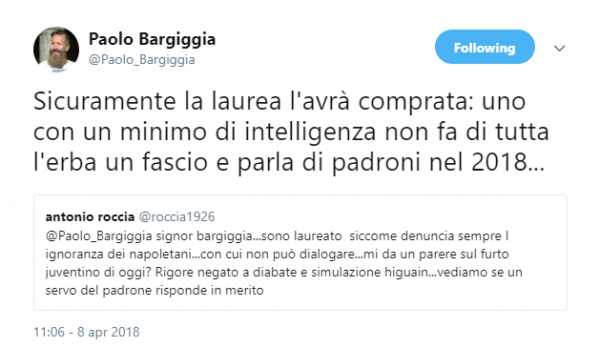 Duro battibecco tra Paolo Bargiggia e un tifoso napoletano su Twitter. Il motivo della diatribe è il rigore concesso alla Juve per il fallo su Higuain, ritenuto inesistente dal supporter partenopeo. L’utente incalza così: “Signor bargiggia…sono laureato siccome denuncia sempre l’ignoranza dei napoletani…con cui non può dialogare…mi da un parere sul furto juventino di oggi? Rigore negato a diabate e simulazione higuain…vediamo se un servo del padrone risponde in merito”