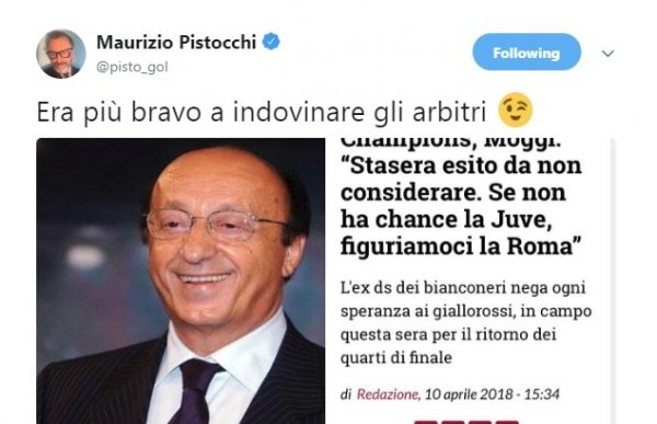 Tra questi c’è Luciano Moggi che, come sottolinea il giornalista Maurizio Pistocchi su Twitter, aveva già decantato il de profundis della squadra di Eusebio Di Francesco. Decisamente pungente Pistocchi che ironizza sull’ex d.g. bianconero: “Era più bravo a indovinare gli arbitri“.