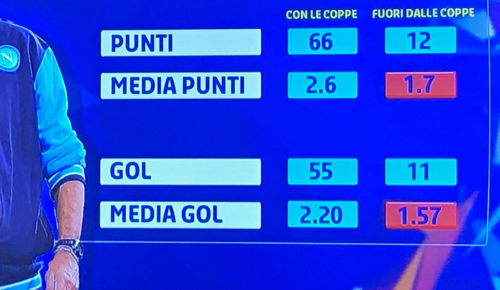 C’è un dato, però, proposto negli studi di PremiumSport, che dimostra che il Napoli abbia ridotto la propria produttività, sia dal punto di vista dei punti ottenuti che dei gol fatti, in seguito all’uscita dalle coppe.