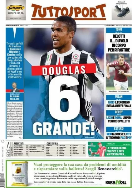 Online la prima pagina del quotidiano sportivo Tuttosport, che pone l’accento sulla distanza in classifica tra Juventus e Napoli e sull’impatto che Douglas Costa ha avuto sulla vittoria della Juventus contro la Sampdoria.