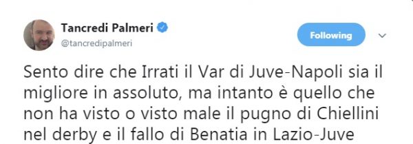 “Sento dire che Irrati il Var di Juve-Napoli sia il migliore in assoluto, ma intanto è quello che non ha visto o visto male il pugno di Chiellini nel derby e il fallo di Benatia in Lazio-Juve“.
