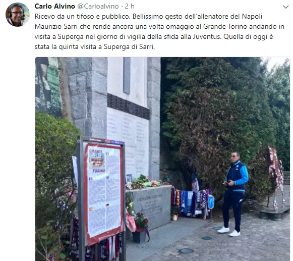 Ancora una visita a Superga per Maurizio Sarri. Il tecnico del Napoli è molto legato al luogo dove i calciatori del Grande Torino persero la vita e, ogni volta che può, torna per far visita. Anche oggi non si è risparmiato: ha viaggiato in disparte ed ha reso ancora una volta omaggio ai caduti di Superga.