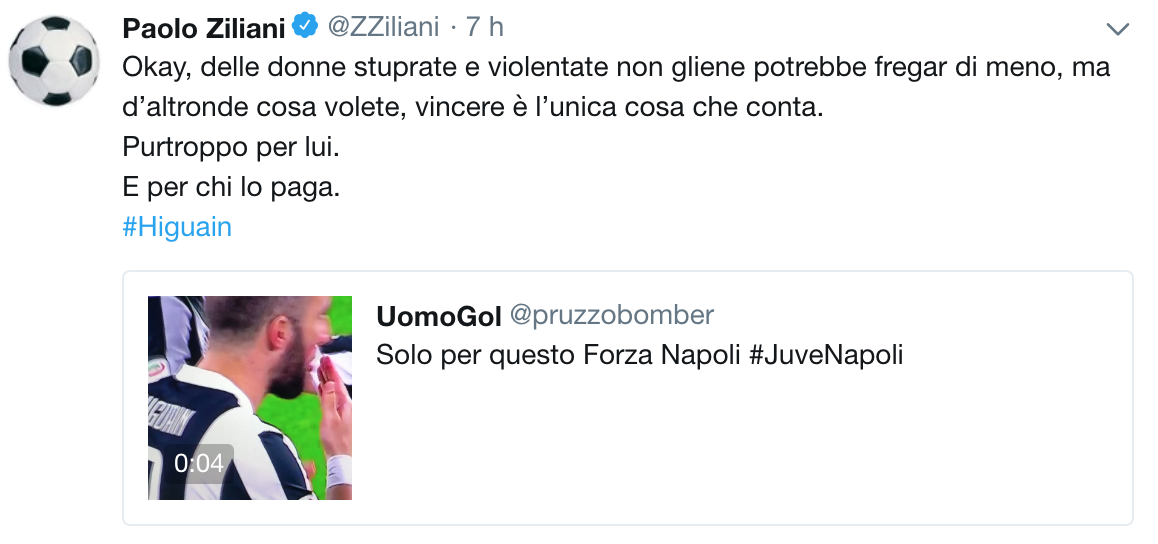 Pungente il commento del giornalista del Fatto Quotidiano, Paolo Ziliani sul proprio profilo Twitter, il quale ha commentato così i pochi secondi di video che ritraggono la scena: “Okay, delle delle donne stuprate e violentate non gliene potrebbe fregar di meno, ma d’altronde cosa volete, vincere è l’unica cosa che conta. Purtroppo per lui. E per chi lo paga”.