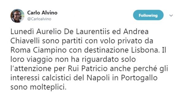 Ecco quanto scritto: “Lunedì Aurelio De Laurentiis ed Andrea Chiavelli sono partiti con volo privato da Roma Ciampino con destinazione Lisbona. Il loro viaggio non ha riguardato solo l’attenzione per Rui Patricio anche perché gli interessi calcistici del Napoli in Portogallo sono molteplici“.