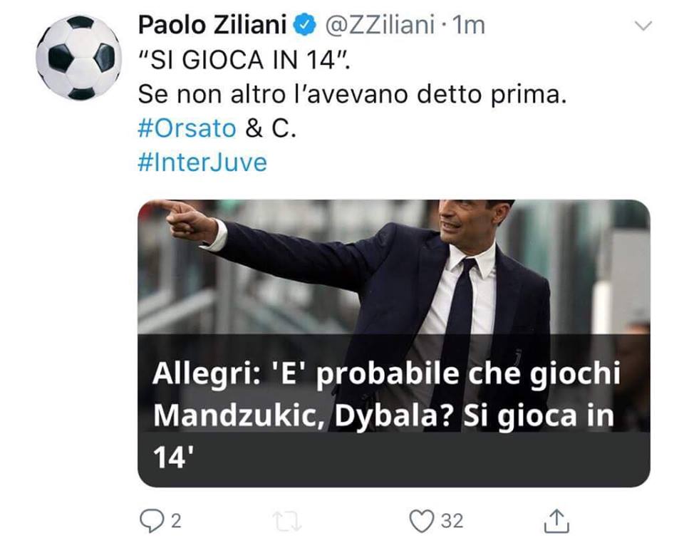Sui social si stanno scatenando le critiche, aspre, dei tanti contestatori della Juve. Paolo Ziliani è tra questi ed infatti, tramite un post a dir poco polemico, che richiamava l’errore di Allegri ieri in conferenza stampa, in cui diceva che la Juve avrebbe giocato in quattordici.