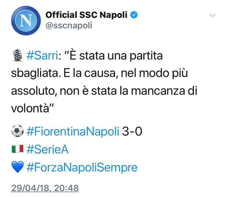 Maurizio Sarri al termine della pesante sconfitta di Firenze ha rilasciato delle dichiarazioni per il sito ufficiale della società azzurra: