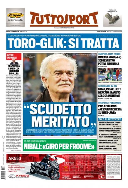 Online la prima pagina dell’edizione di domani di Tuttosport. Ampio spazio ad un’intervista realizzata dal quotidiano con Sandro Mazzola, il quale afferma che la Juventus ha meritato lo Scudetto, nonostante sia chiaro che Orsato sabato sera abbia sbagliato. “Nessuna inchiesta su Inter-Juve”, inoltre, il virgolettato di Pecoraro, procuratore federale.