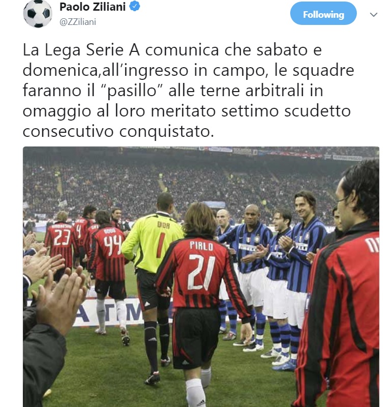 Questo il suo ironico tweet: “La Lega Serie A comunica che sabato e domenica,all’ingresso in campo, le squadre faranno il “pasillo” (il tipico corridoio creato da una squadra per tributare l’applauso all’avversario, ndr) alle terne arbitrali in omaggio al loro meritato settimo scudetto consecutivo conquistato”.