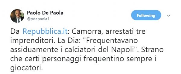 Ebbene la notizia è stata commentata da tanti addetti ai lavori, tra questi è stato particolarmente pungente il tweet dell’ex direttore di Tuttosport, Paolo De Paola: “Da Repubblica.it: Camorra, arrestati tre imprenditori. La Dia: “Frequentavano assiduamente i calciatori del Napoli”. Strano che certi personaggi frequentino sempre i giocatori“.