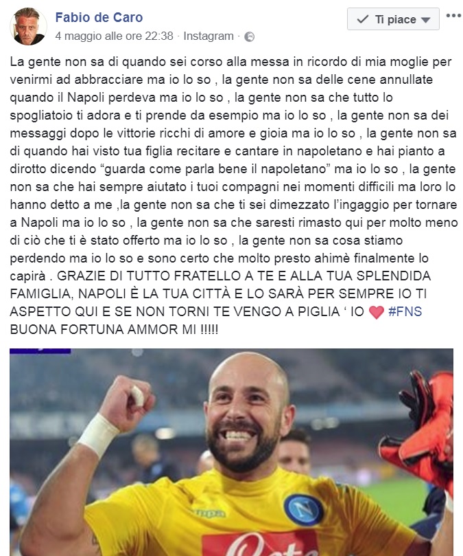 L’annunciato addio di Pepe Reina a fine stagione ha diviso i cuori dei napoletani. Tra chi si è sentito tradito e chi ne ha capito le motivazioni. Tra coloro che lo difendono a spada tratta c’è stato l’amico Fabio de Caro, attore che vestiva i panni di Malammore nella serie Gomorra, che ha voluto dedicargli uno splendido messaggio sui social.