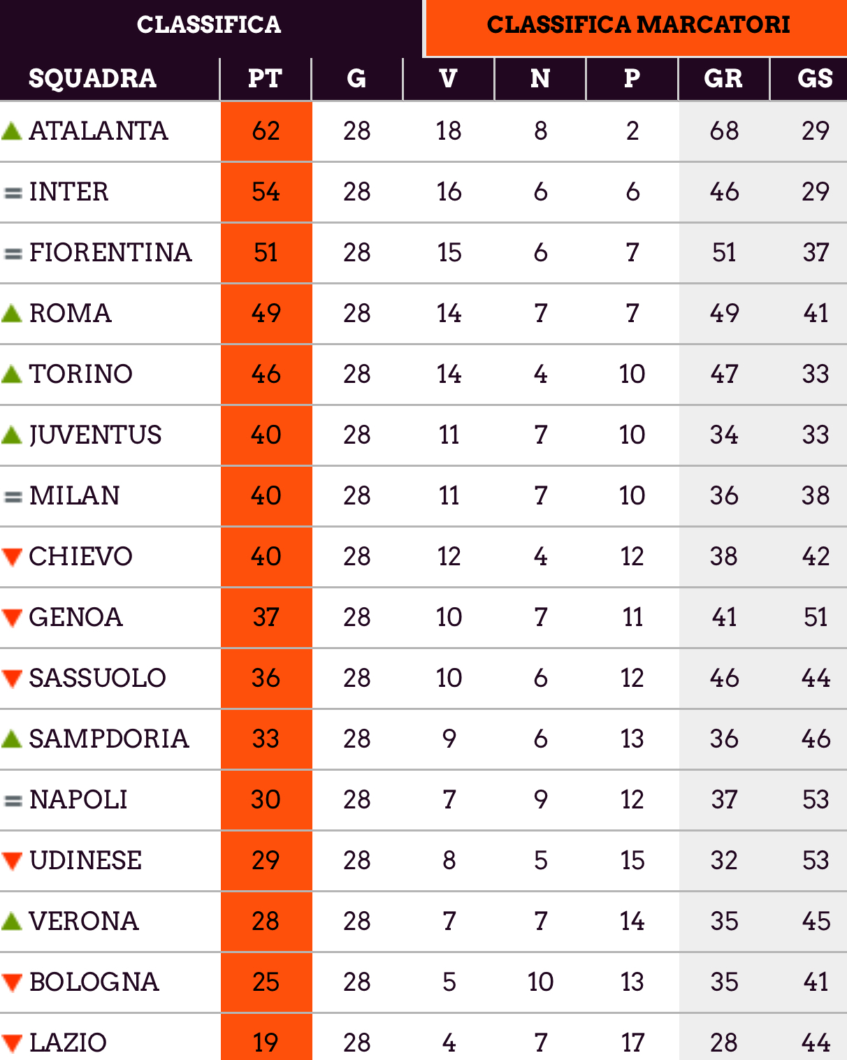 29ª giornata: Torino-Napoli, Sampdoria-Juventus, Verona-Genoa, Udinese-Milan.