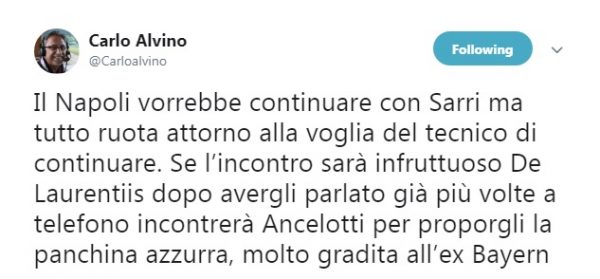 A fornire nuovi aggiornamenti, confermando anche i contatti con l’ex allenatore del Bayern Monaco, è stato il giornalista di TV Luna Carlo Alvino, che su Twitter ha scritto: “Il Napoli vorrebbe continuare con Sarri ma tutto ruota attorno alla voglia del tecnico di continuare. Se l’incontro sarà infruttuoso De Laurentiis dopo avergli parlato già più volte a telefono incontrerà Ancelotti per proporgli la panchina azzurra, molto gradita all’ex Bayern“.