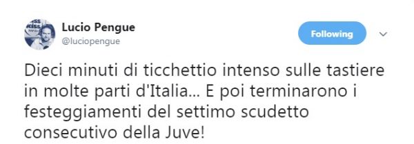 “Dieci minuti di ticchettio intenso sulle tastiere in molte parti d’Italia… E poi terminarono i festeggiamenti del settimo scudetto consecutivo della Juve!“.