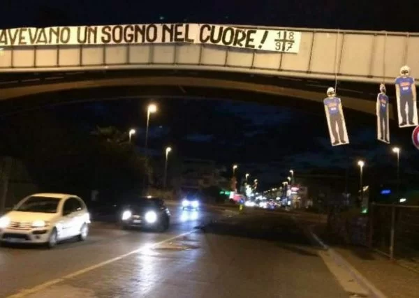 Infatti, pare che alcuni tifosi della Juventus, per sbeffeggiare i rivali napoletani, abbiano calato tre manichini con tanto di maglia del Napoli e maschera di pulcinella simulando la loro impiccagione. Inoltre campeggia anche uno striscione che recita: “Avevano uno striscione nel cuore!“.