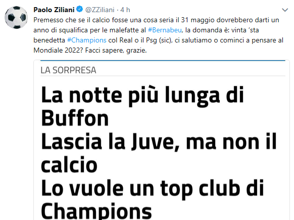 “Premesso che se il calcio fosse una cosa seria il 31 maggio dovrebbero darti un anno di squalifica per le malefatte al #Bernabeu, la domanda è: vinta ‘sta benedetta #Champions col Real o il Psg (sic), ci salutiamo o cominci a pensare al Mondiale 2022? Facci sapere, grazie” – il durissimo commento di Ziliani.