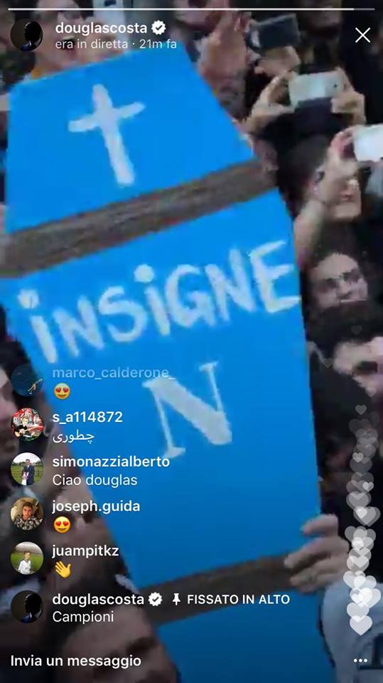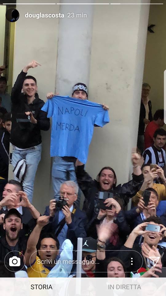 Festeggiamenti vergognosi in casa Juventus. In diversi video pubblicati su Instagram da Douglas Costa, spuntano due immagini inquietanti: la prima ritrae un cartello con la scritta “Napoli mer*a”, il secondo la tomba di Insigne.