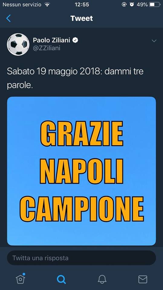 In uno dei suoi tanti messaggi “cinguettati” quest’oggi ce n’è uno che particolarmente è piaciuto ai tifosi partenopei: Ziliani ha lasciato intendere che, in contrapposizione con la festa-scudetto della Juve oggi, l’unico scudetto da festeggiare sarebbe quello del Napoli. Inutile dire che il tweet ha raccolto consensi su consensi.