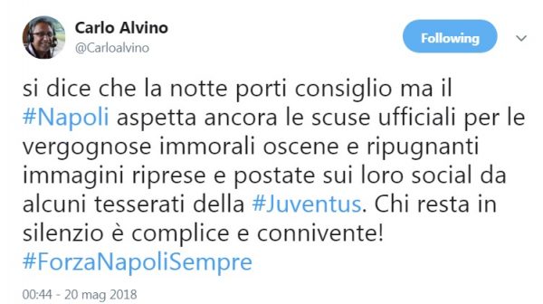 Il giornalista Carlo Alvino è intervenuto sul proprio profilo twitter a tal proposito: “Si dice che la notte porti consiglio ma il Napoli aspetta ancora le scuse ufficiali per le vergognose immorali oscene e ripugnanti immagini riprese e postate sui loro social da alcuni tesserati della Juventus. Chi resta in silenzio è complice e connivente!”.