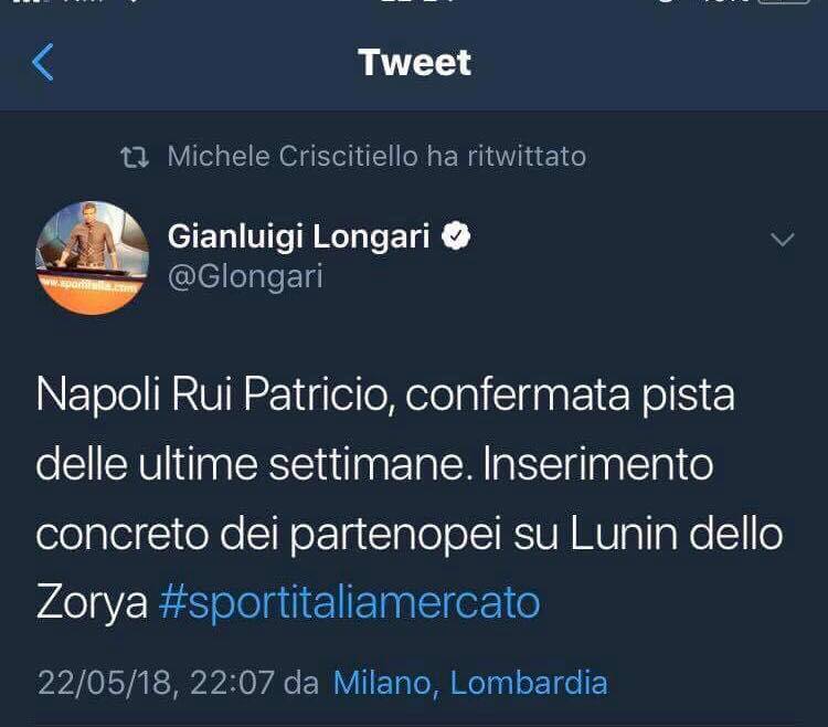 Sono ore calde quelle in casa Napoli, con il futuro della panchina partenopea più acceso che mai. Ancelotti sempre più vicino, Sarri invece si allontana. Nel frattempo De Laurentiis deve guardarsi attorno anche per iniziare a costruire la rosa 2018-19. A partire dalla porta, dove Rui Patricio sembra essere sempre più vicino.