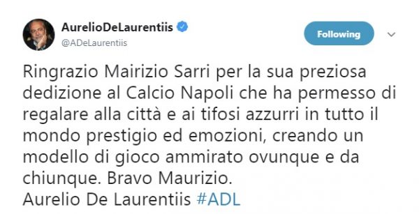 “Ringrazio Mairizio Sarri per la sua preziosa dedizione al Calcio Napoli che ha permesso di regalare alla città e ai tifosi azzurri in tutto il mondo prestigio ed emozioni, creando un modello di gioco ammirato ovunque e da chiunque. Bravo Maurizio.
