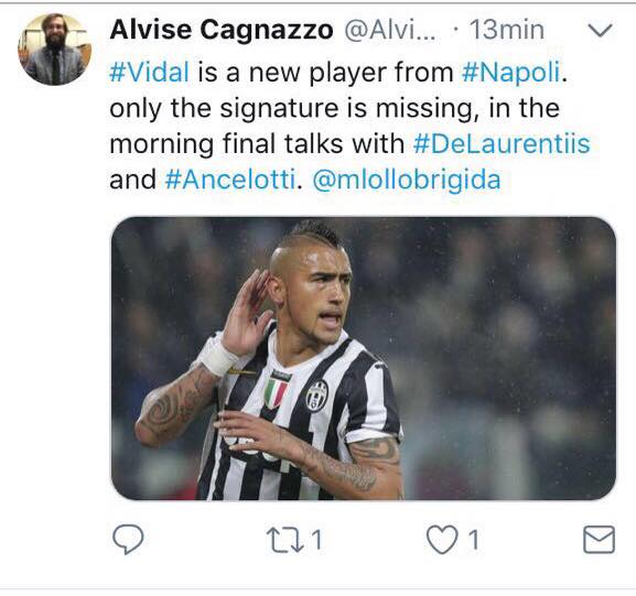“Vidal è un nuovo giocatore del Napoli, manca solo la firma. Nella mattinata si sentirà con De Laurentiis ed Ancelotti“.