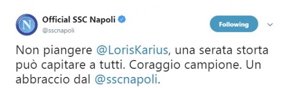 A rincuorare il calciatore, oltre al tecnico Klopp e ai suoi compagni, ci ha pensato anche il Napoli con un messaggio su Twitter: “Non piangere @LorisKarius, una serata storta può capitare a tutti. Coraggio campione. Un abbraccio dal @sscnapoli“.