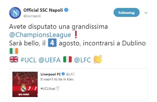 Sta avendo grande seguito il messaggio del Napoli nei confronti del Liverpool, a seguito della sconfitta dei Reds in finale di Champions League per 3-1 con il Real Madrid.