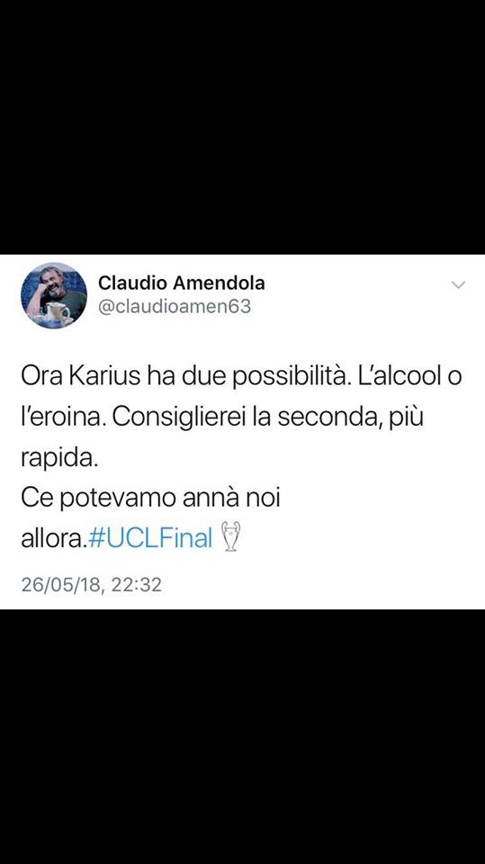 “Ora Karius ha due possibilità – ha scritto Amendola su Twitter – l’alcool o l’eroina. Consiglierei la seconda, più rapida. Ce potevamo annà noi allora!”. Davvero un’uscita infelice e di cattivo gusto, quella dell’attore che, fortunatamente, è stato subito attaccato e fortemente criticato da tutta la community italiana di Twitter.