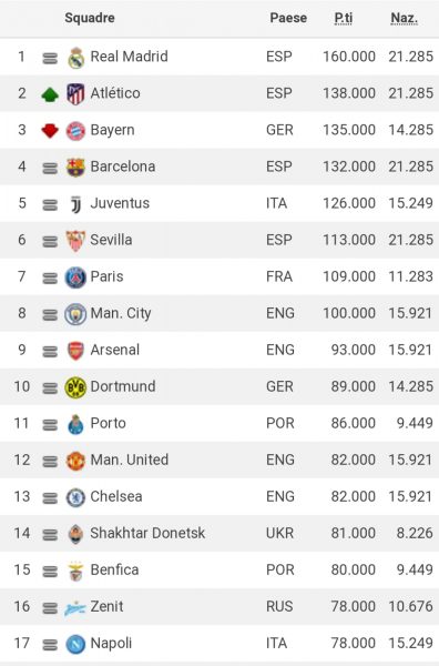 Si è conclusa la stagione 2017-2018, questo è il ranking UEFA da cui ripartire la prossima stagione. Il Napoli chiude al sedicesimo posto insieme allo Zenit, i russi però hanno avuto un punteggio stagionale migliore (14 punti contro i 10 conquistati dagli azzurri).