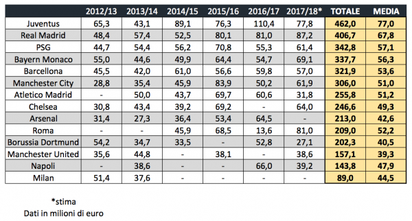 “Dal 2012/13 il club bianconero ha guadagnato dai soli premi Uefa (comprensivi cioè di market pool e premi di rendimento) circa 462 milioni di euro, con una media di 77 milioni annui: poco meno di 10 milioni all’anno in più rispetto al Real Madrid, che si è fermato a 406,7 milioni (media 67,8 milioni annui).Bianconeri e blancos sono le uniche squadre che hanno superato i 400 milioni complessivi: il Paris Saint-Germain, terzo in questa speciale graduatoria, si è fermato a 342 milioni, circa 120 in meno rispetto alla Juventus. Per i francesi, vale lo stesso discorso dei bianconeri, dato che spesso si sono trovati a dividere i ricavi soltanto con un’altra squadra della stessa nazione”.